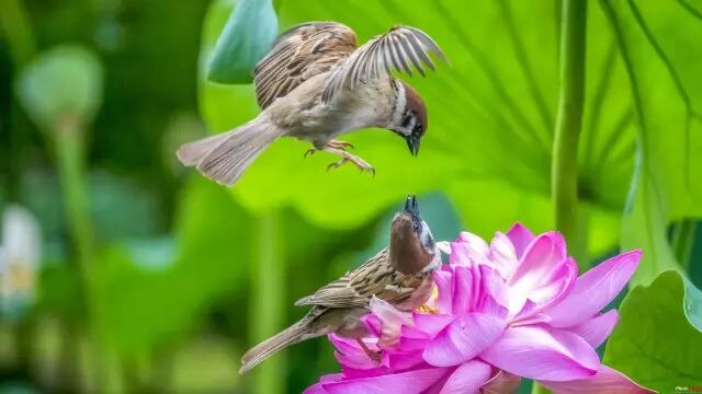 全路老师通过捕捉两只小麻雀嬉戏的瞬间,表现出美好动感的一刻。画面构图很自然,色调清新素雅,整个画面的构成让人浮想联翩,两只麻雀形态各异,自由自在。虚化的背景,使得鸟儿与荷花融为一体,美轮美奂。