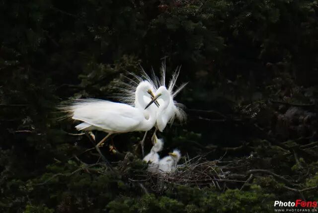 白鹭修长的双腿,优雅的姿势多么像杰出的“芭蕾舞大师”。幸福之家老师对图片明暗关系处理的非常到位,主体物突出,与暗部的背景形成了鲜明的对比。两只小白鹭等着爸爸妈妈喂食,捕捉到美好的一幕组成这定格时间里最温馨的一家。