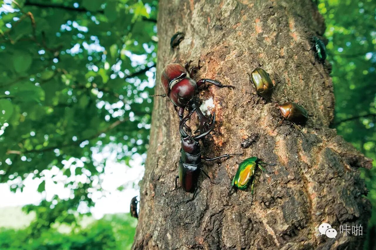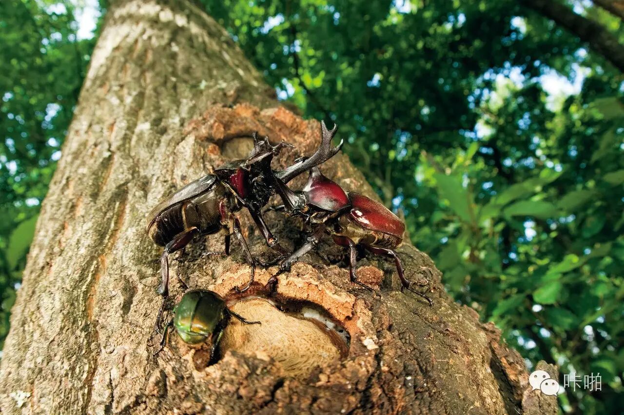 雄性甲壳虫为争夺吸食树液的最佳位置而展开激战。为拍摄格斗中的甲壳虫,我将一台闪光灯放在画面下方进行补光。有趣的是,当两只甲壳虫激战正酣之时,另一只甲壳虫却趁机靠近了树液溢出之处。