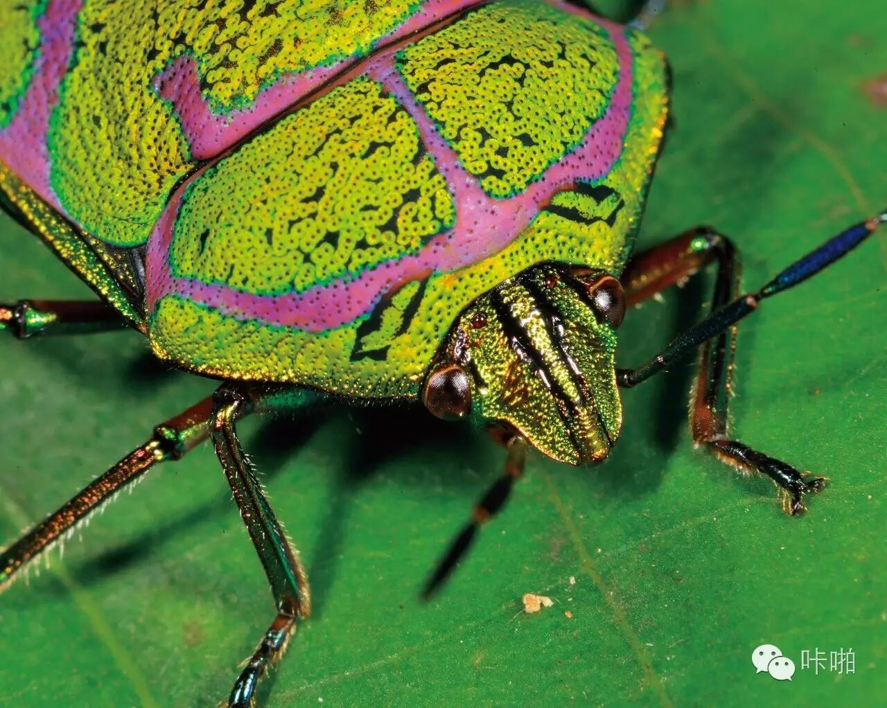 在D800上使用等倍微距镜头拍摄体长20mm左右的金绿宽盾蝽时,只能拍到其全身影像。加装原厂2倍增距镜后就可以拍摄上半身特写了。这张照片以Speedlight SB-910为主灯,配合两台微距闪光灯进行补光,以获得阴影较少的画面效果。