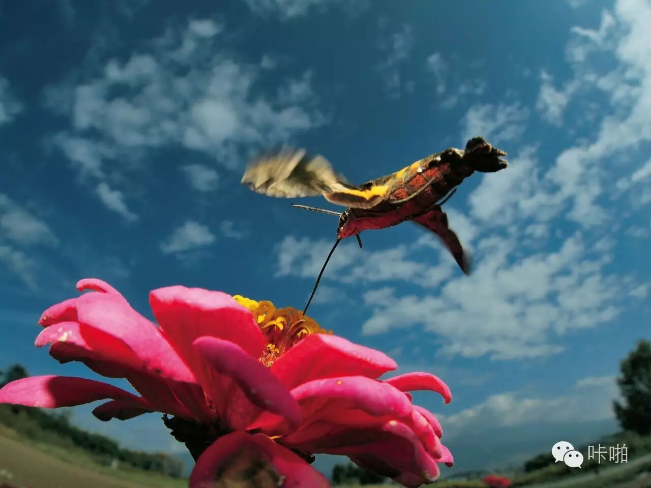 在悬停状态下吸食花蜜的长喙天蛾,是相对较容易拍摄的飞行昆虫。为了在背景中放入大片蓝天,这张照片在标准变焦镜头上加装了名为FCON的鱼眼转换镜。利用闪光灯的高速同步模式,可以以1/1000秒的高速快门进行拍摄。