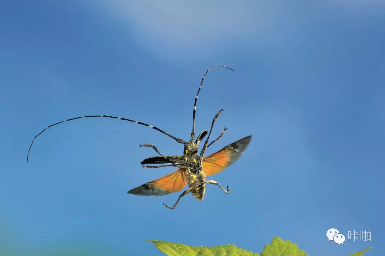 这是在室内拍摄的黄星天牛飞翔情景。黄星天牛是昼行性昆虫,拍摄时在背景中放置了蓝色背景纸,并通过闪光灯进行补光。快门设置为B门(5秒)。如果没有闪光灯,被摄体将会是一片漆黑,常规5秒曝光时间也无法定格昆虫的飞行姿态。从这里就可以看出1/20000秒闪光时间拍摄定格作品的强大之处了。