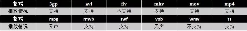 视频格式的测试本来Zoe是想用安兔兔视频测试软件测试的,但是该软件无法运行,所以另选了当前最为常用的12个视频格式进行测试。结果如下:
