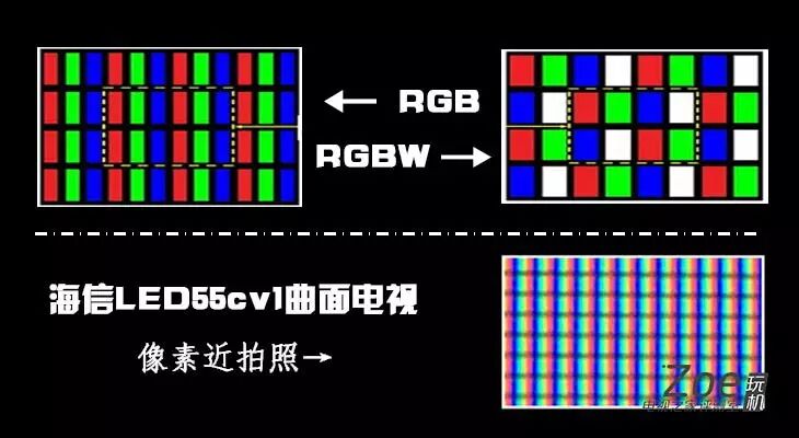 通过实拍,我们可以看到海信LED55V1UC曲面电视的像素排列为RGB格式,也就是目前市面上比较认同的真4K面板,并非为低成本RGBW屏幕。